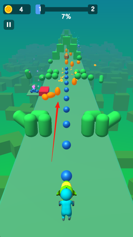 2、游戏过程中,操控角色收集道路上的【金币】和道具,避开障碍物,同时注意屏幕上方的关卡进度提示。
