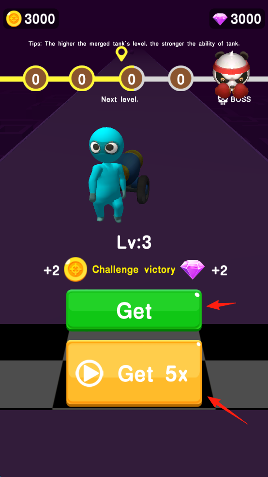 3、挑战胜利后,点击【Get】或【Get5x】按钮领取奖励,获取金币和钻石,提升角色实力。