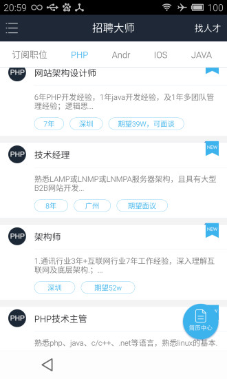 招聘大师app是一款为各大企业打造的招聘应用,招聘大师汇聚大批互联网中高级人才,技术、产品、运营、设计、职能应有尽有,你可以这里轻松的搜寻到各类人才,壮大自己的团队,招聘大师内所有应聘者均有多年工作经验,你可以直接让自己的公司/企业增添一员猛将