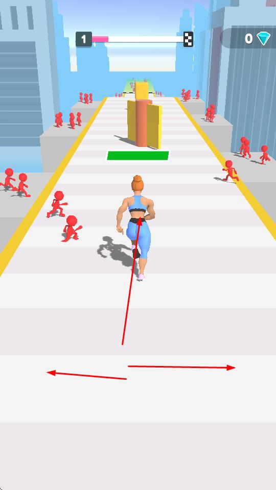 1、玩家操控角色在城市街道场景的道路上向前奔跑,通过左右滑动屏幕控制角色移动方向。