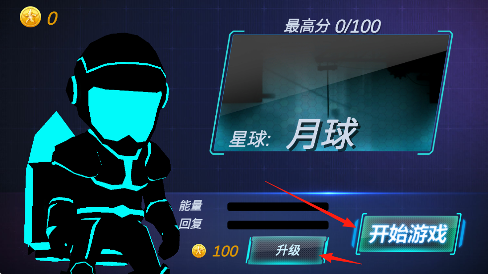 1、在游戏准备界面,可点击【开始游戏】进入关卡,或点击【升级】提升角色能力,使用金币可进行相关操作。