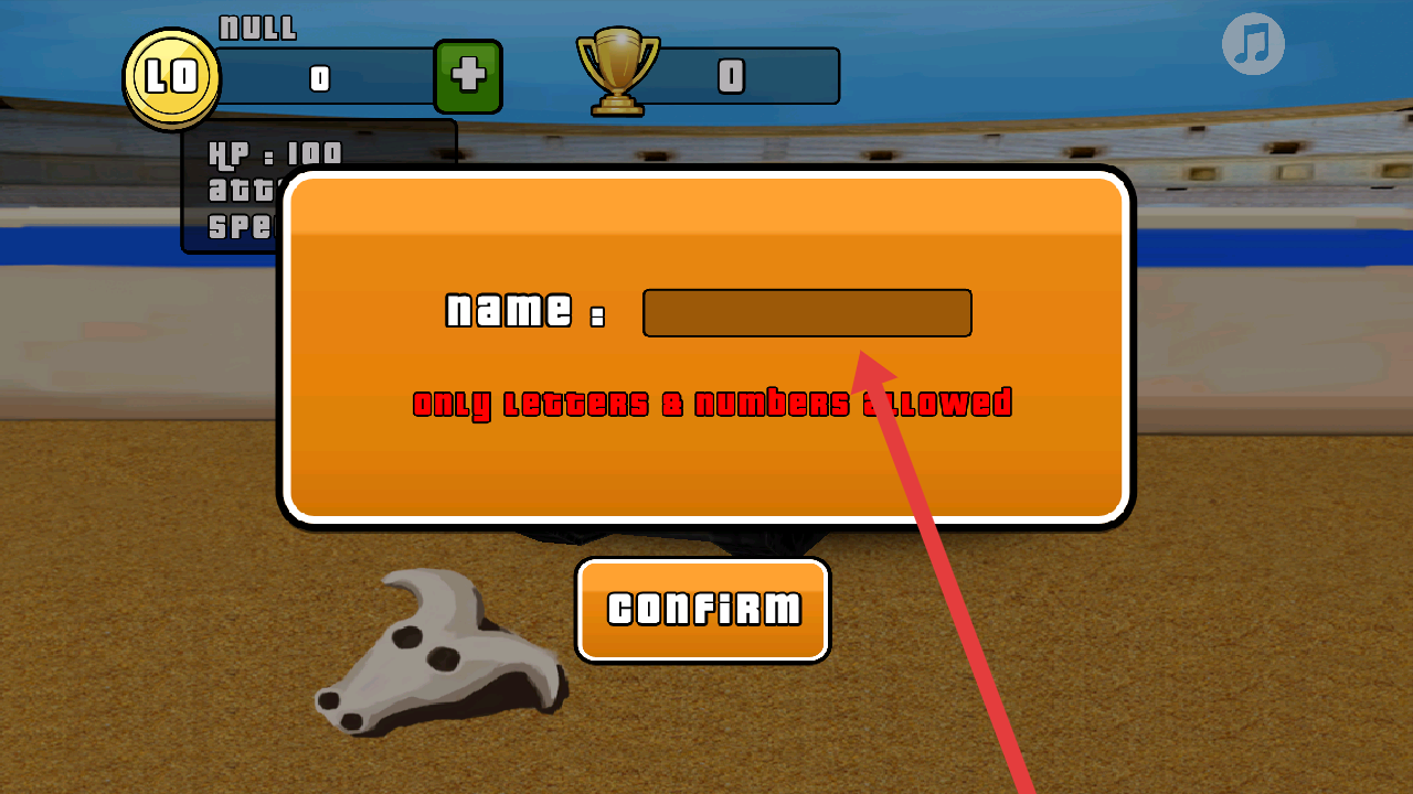 1、在游戏初始界面,输入符合规则(仅字母和数字)的名称,点击【CONFIRM】确认。