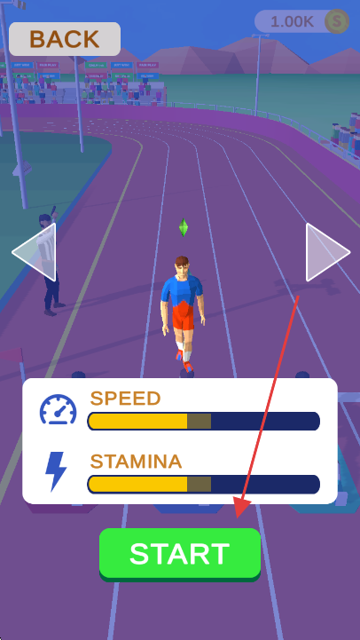 2、选好跑步者后,查看速度与耐力条,点击【START】开启比赛,操控角色在跑道上奔跑竞技。