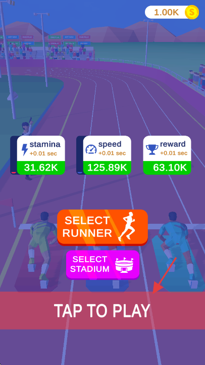 1、点击【TAP TO PLAY】进入游戏,可升级耐力、速度、奖励属性,还能选择跑步者和体育场,做好赛前准备。