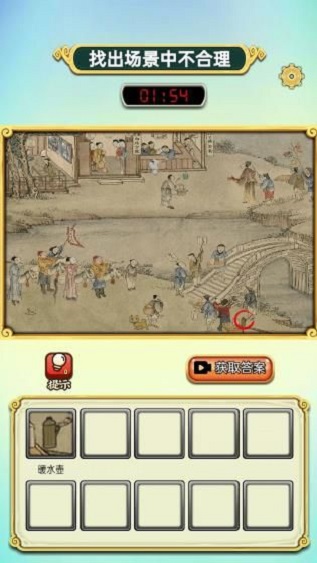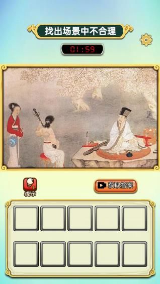 知应达人带来考验眼力的趣味挑战,在精美历史画卷中搜寻隐藏的不合理之处,每幅画面暗藏十个巧妙设计的细节差异,需要细心观察才能发现,遇到困难时可获取提示帮助,轻松休闲的玩法适合消磨时光,既能欣赏艺术画作又能锻炼观察力,找到所有目标即可收获满满成就感,享受发现细节的惊喜乐趣。