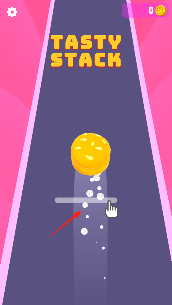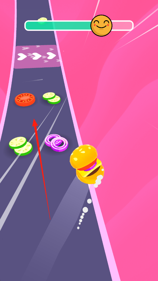 1、游戏开始后可以根据红色指示箭头来通过滑动屏幕操控【汉堡】进行左右移动。