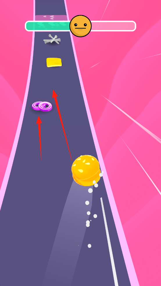 2、在前进过程中,让汉堡收集道路上的【食材】,如洋葱圈、芝士片、番茄片、黄瓜片等,避开【骨头】等障碍物。