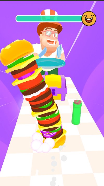 2、双人协作模式:支持分屏合作玩法,两人分别控制底包左右两侧,同步倾斜设备接住对称食材,适合情侣或好友挑战高难度“双人摩天汉堡”。
