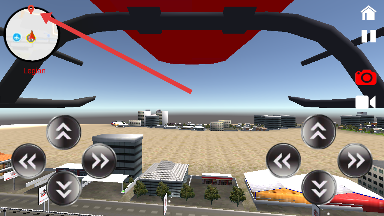 3、根据左上角地图上的红色标记(箭头指向),利用下方操控按钮驾驶直升机,朝着目标地点飞行,完成导航任务。