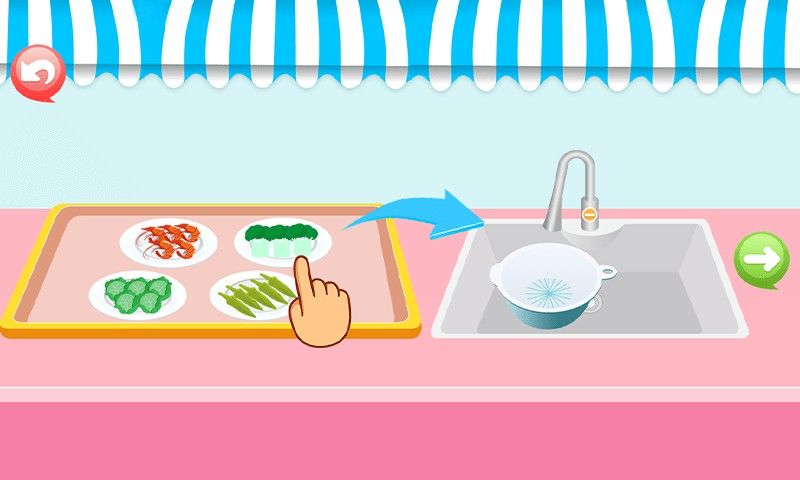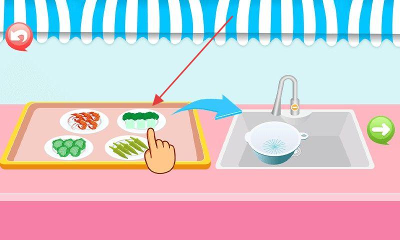 2、首先对食材进行处理,点击选择托盘上的食材,按指示将其移至水槽清洗,完成食材准备。