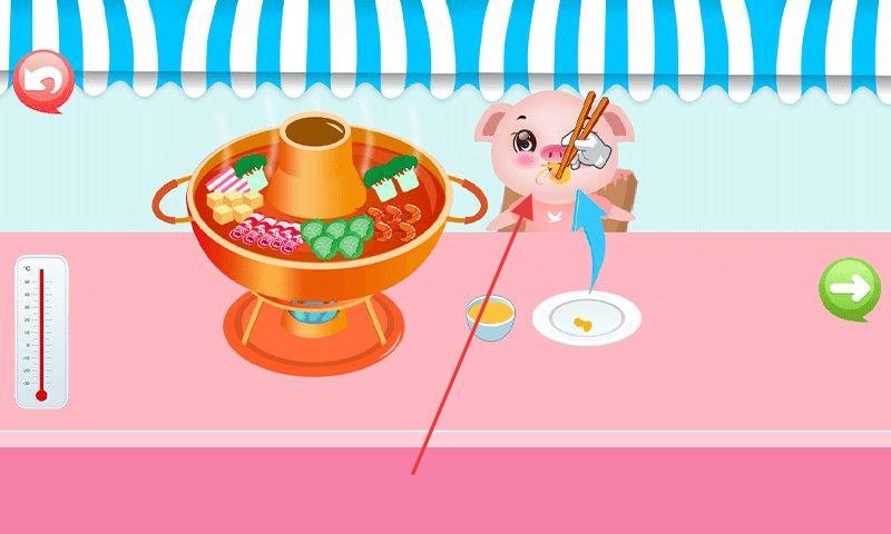 3、将清洗好的食材放入火锅中烹饪,留意温度计等提示,适时操作,最后帮助小猪等角色享用火锅。