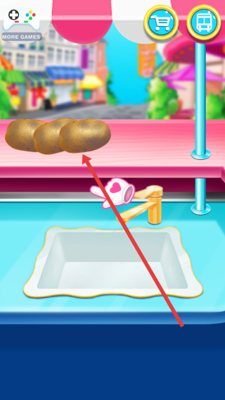 2、进入烹饪准备环节,按箭头指向,将土豆拖动到水槽中,准备清洗。