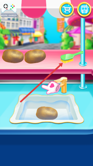 3、在清洗操作界面,按箭头指示,将刷子拖动到水槽中的土豆上,对土豆进行刷洗,完成食材预处理步骤。
