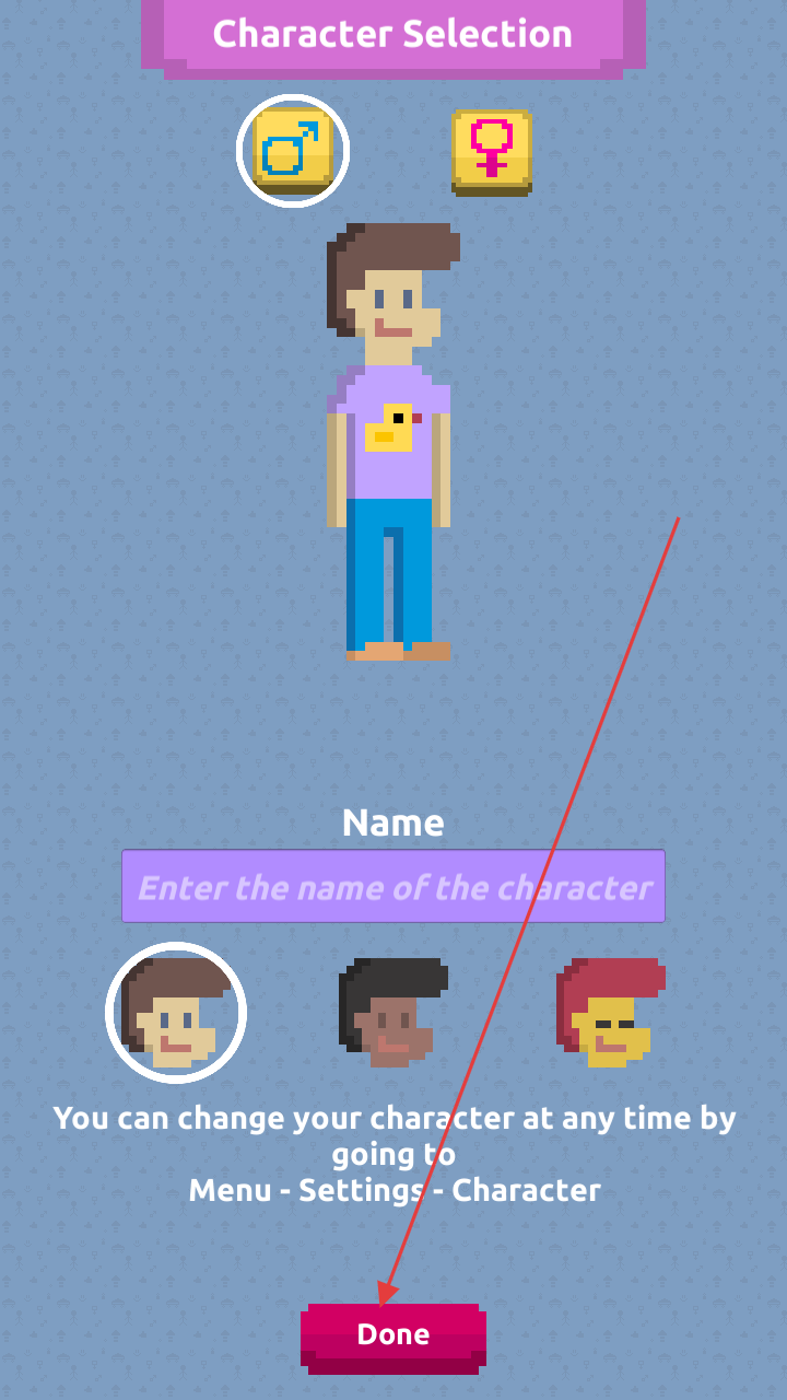 1、在角色选择界面,选择性别图标,在输入框输入角色名字,点击“Done”确定角色。