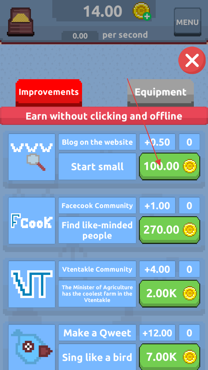 3、点击“MENU”进入功能界面,在“Improvements”选项下,选择“Startsmall”等项目花费金币升级,提升收益。