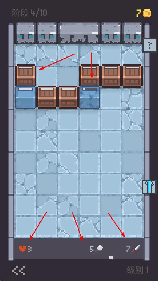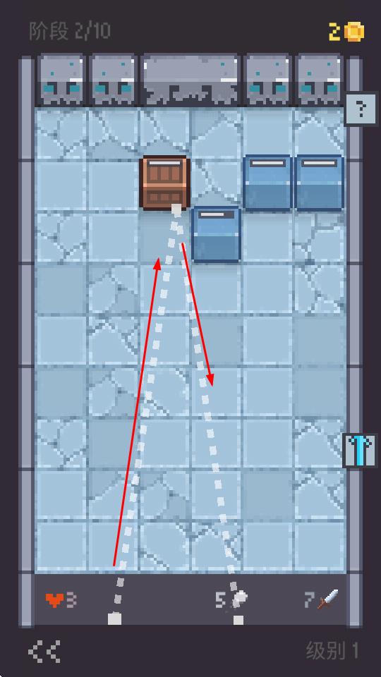 1、玩家在像素风格的关卡场景中,操控角色攻击箱子,按照特定路线攻击箱子,完成关卡目标。