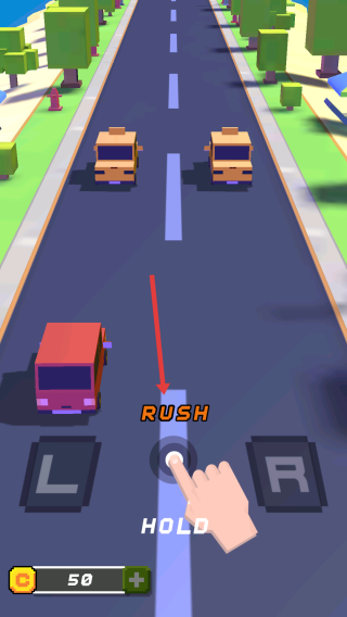 3、当需要加速时,按住箭头所指标有【RUSH】的按钮,使车辆加速前进。