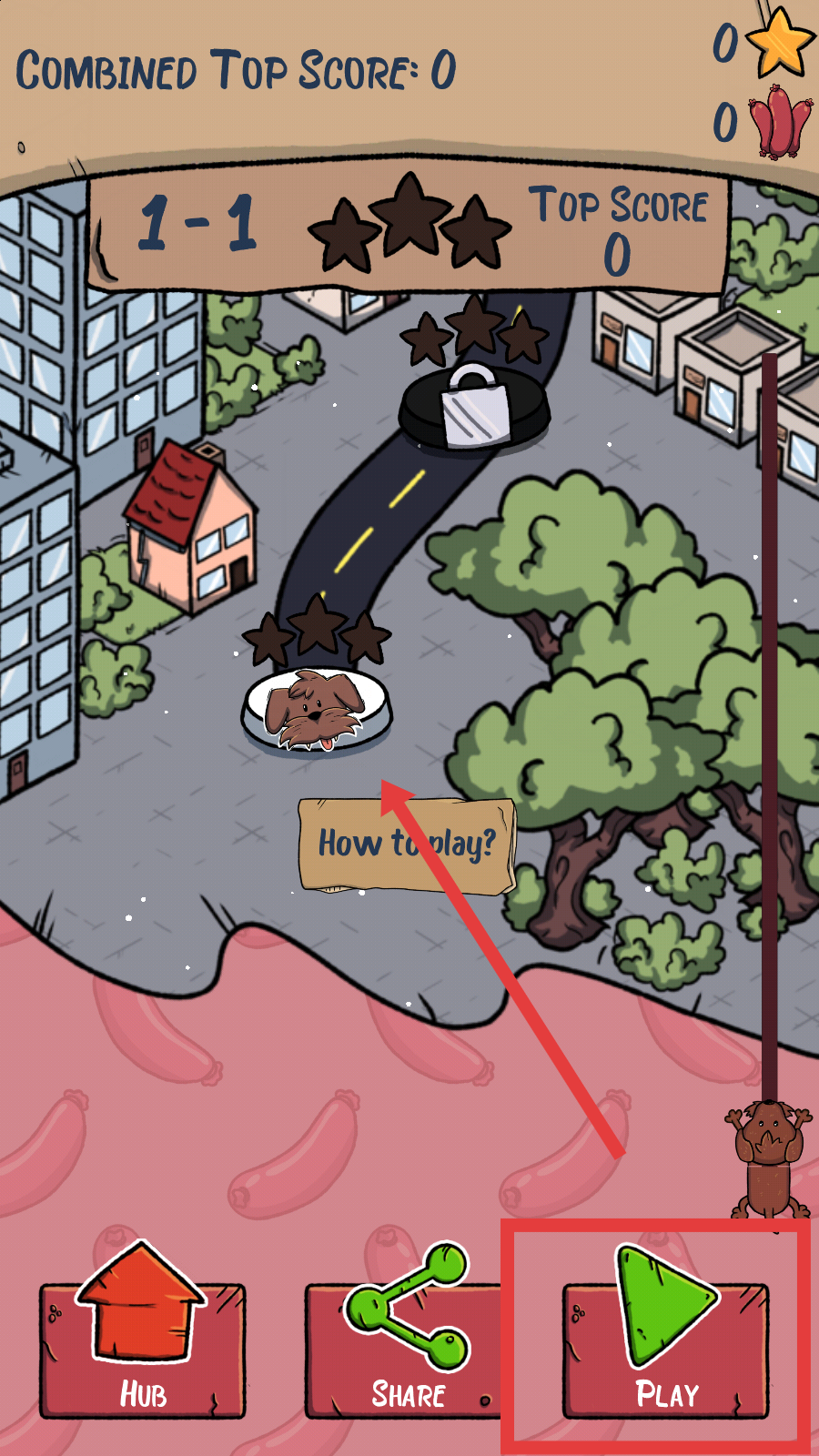 3、进入关卡界面后,按箭头指示,再次点击“PLAY”按钮,正式开始关卡1-1的游玩,操控角色进行香肠收集等游玩任务。