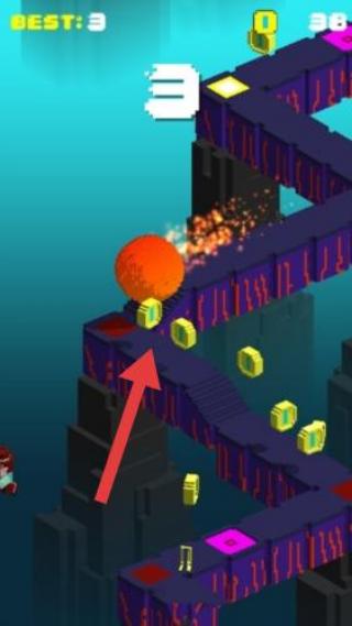 2、操控角色按箭头方向前进,收集途中金币,避开红色火球等障碍。