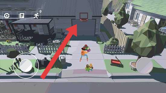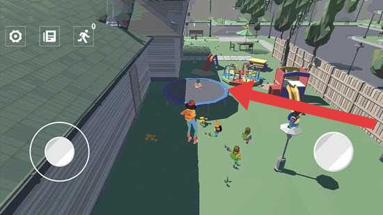 1、进入游玩场景,按箭头指示,操控角色靠近后院的蹦床,可利用蹦床进行跳跃等操作,探索周边区域。