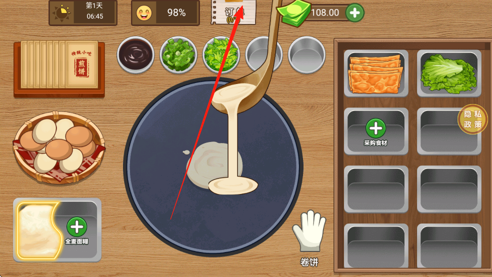 2、煎饼制作操作:通过点击屏幕完成煎饼制作,简单直观的操作中需把控火候与配料比例,满足订单需求并提升效率。