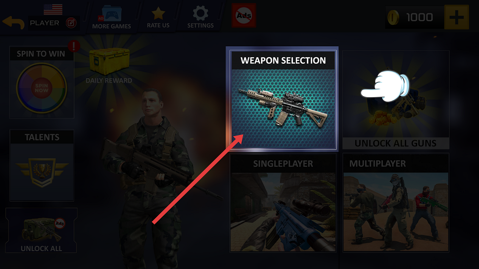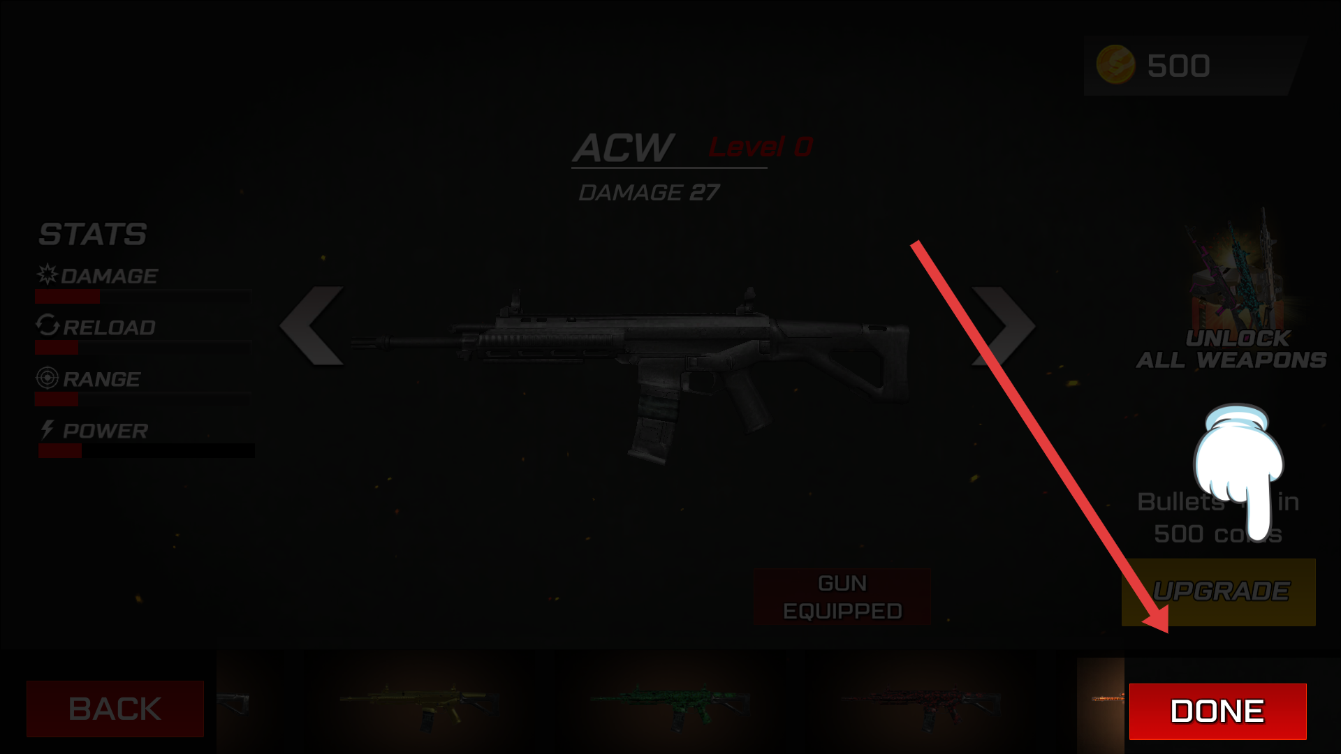 2、从手枪到火箭筒任君挑选,然后点击DONE完成正式迈入战场。