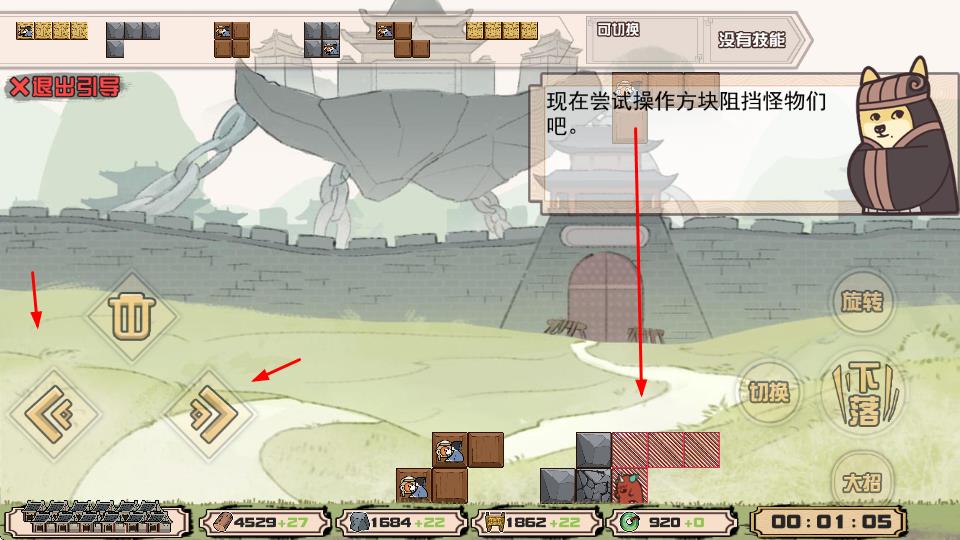 1、玩家通过屏幕下方的方向键操控方块移动,利用“旋转”“下落”等功能键调整方块位置和形态,阻挡怪物前进路线。