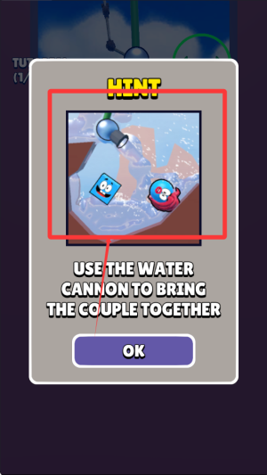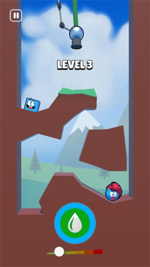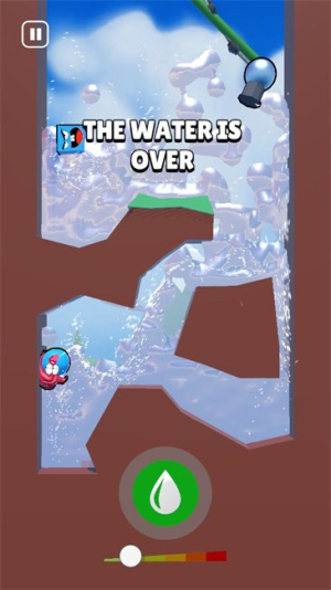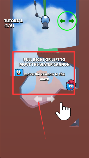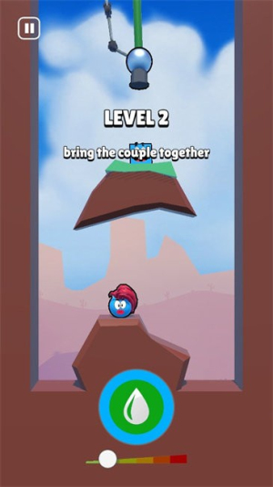 1、基础玩法,玩家通过左右移动水管调整水流方向,点击水滴按钮释放水源,引导角色到达指定位置完成汇合。
