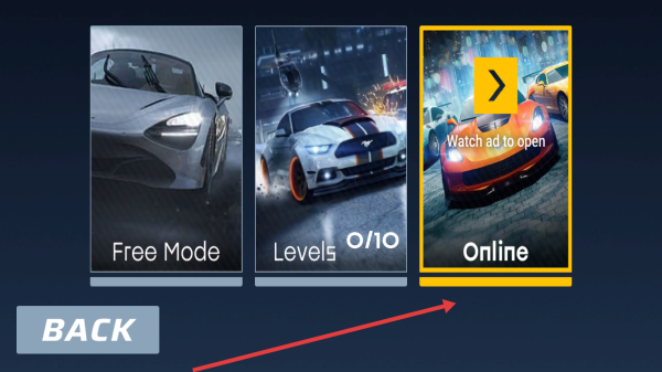 2、在游戏模式选择界面,选择【Online】模式,按箭头指示进行相应操作(如需观看广告解锁)。
