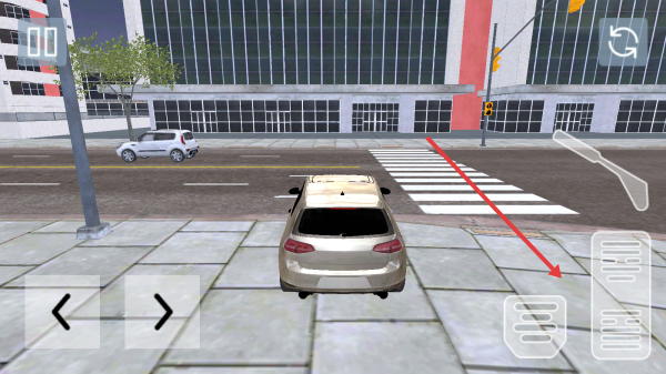 3、进入游戏驾驶界面后,按箭头所指点击右侧的驾驶控制按钮,操控汽车行驶。