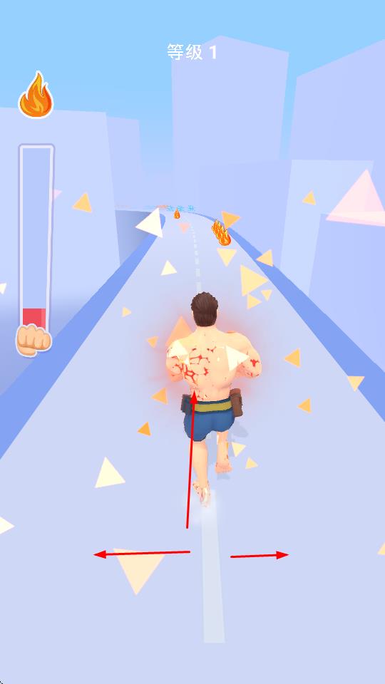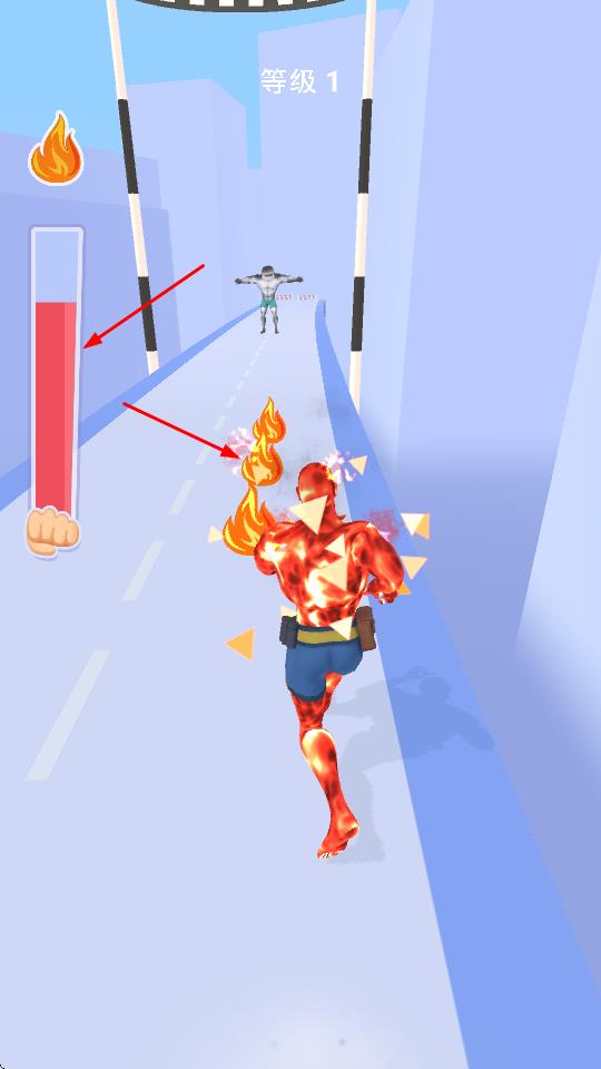 1、玩家操控角色在道路上跑酷,通过收集道路上的火焰道具等,提升角色能力,使角色外观和状态发生变化,如角色身体燃起火焰。
