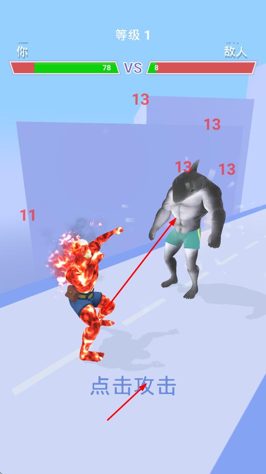 3、跑酷到达特定地点后,角色与敌人进行战斗,玩家需点击屏幕进行攻击,根据伤害数值显示判断攻击效果,击败敌人以完成关卡。
