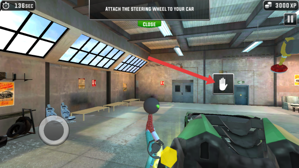 3、游戏中根据提示操控自己的角色,前往箭头指向的手部图标位置,进行方向盘安装操作。