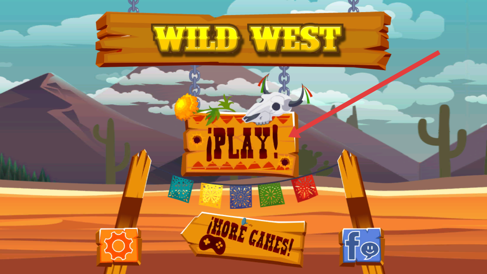 1、进入游玩主界面,按箭头指示,点击“PLAY!”按钮,开启荒野西部冒险。