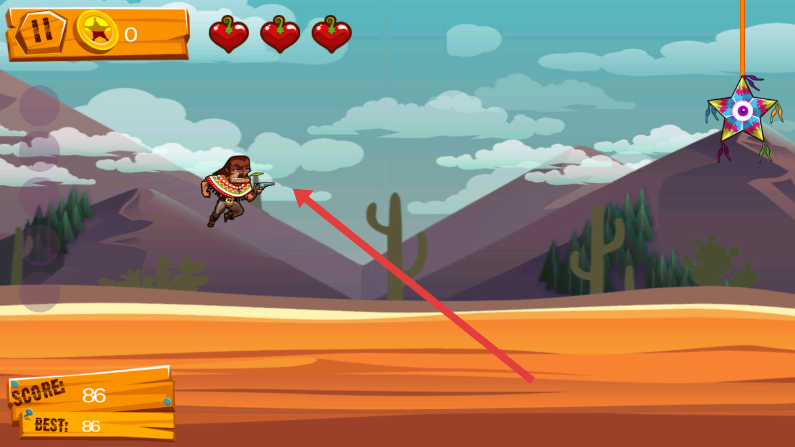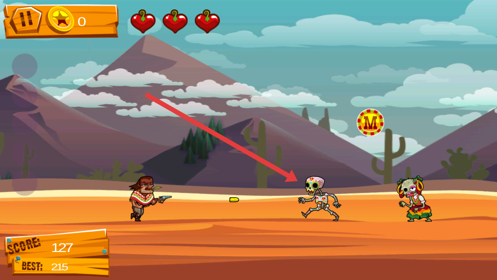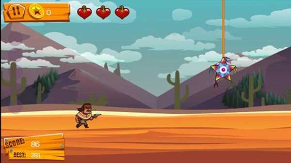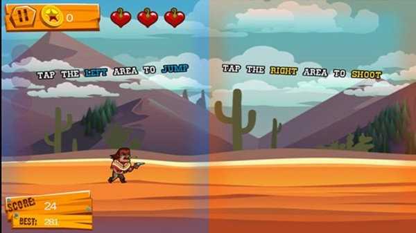 2、在游玩场景,操控牛仔角色,按箭头指向,跳跃越过障碍,利用枪支射击目标。