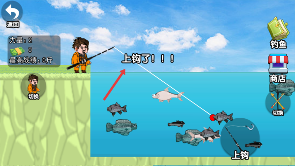3、当鱼上钩后,按箭头指示点击“上钩”按钮,钓起鱼。