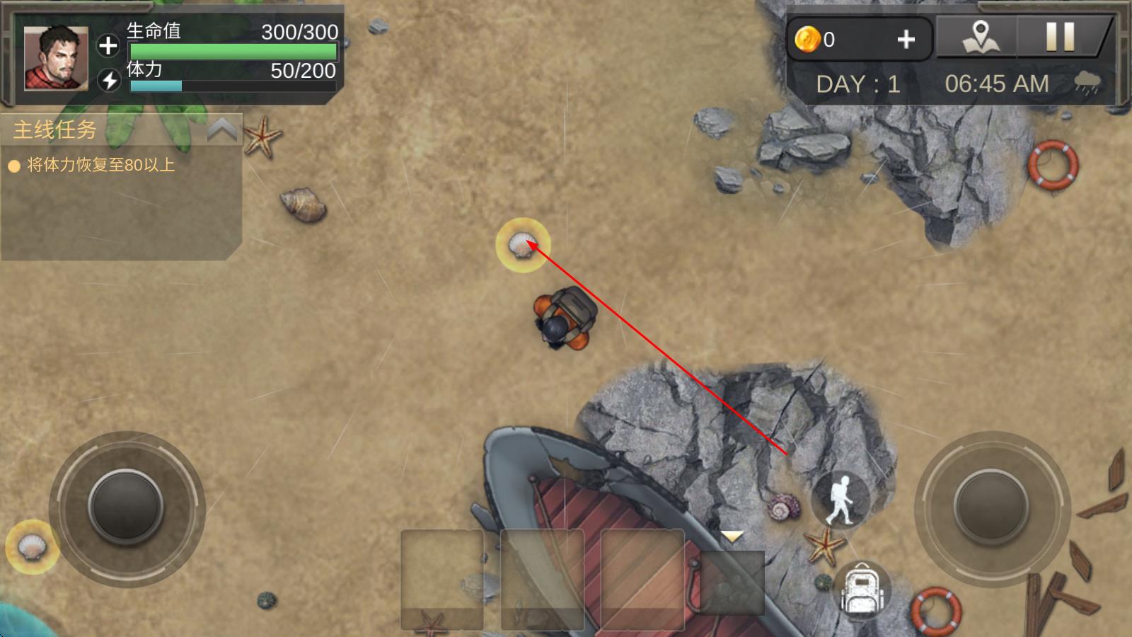 1、初入荒岛,玩家面对变异生物威胁,需立即收集基础资源,利用双轮盘操作探索安全区域,开启末日生存之旅。