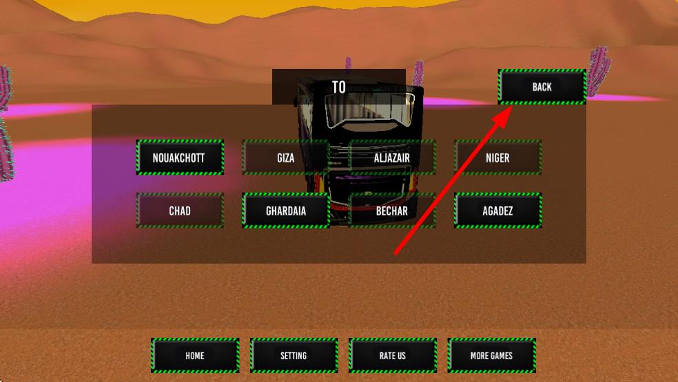 2、若需调整行程,点击“BACK”返回上一界面,确认路线后,进入驾驶环节,操控巴士穿越沙漠。