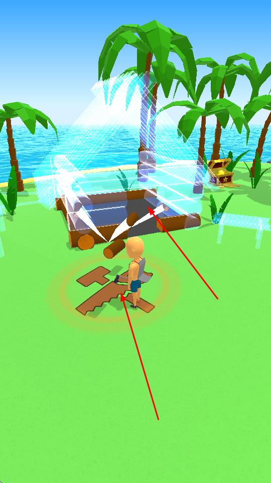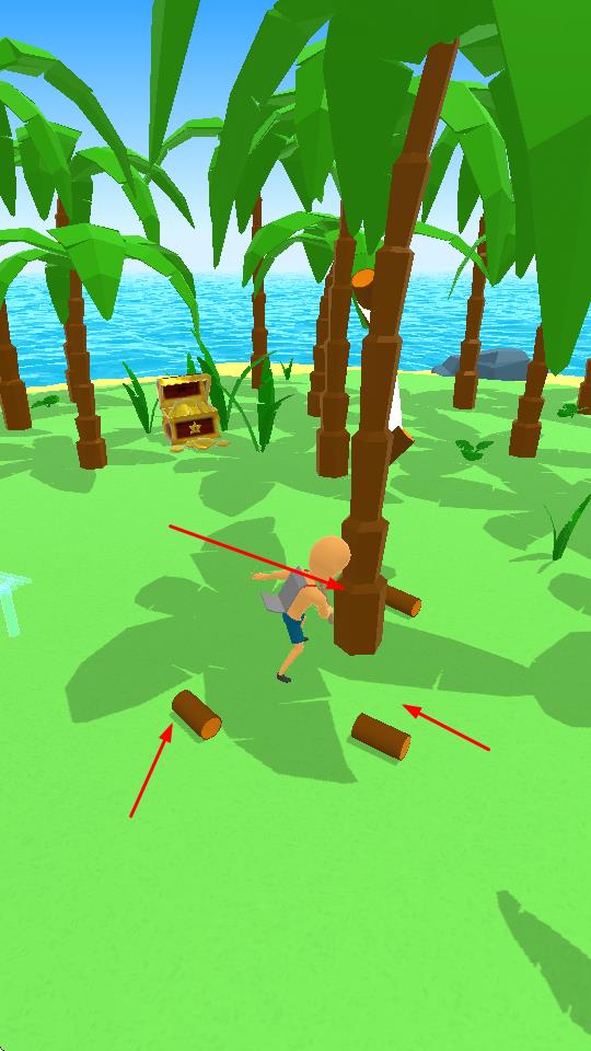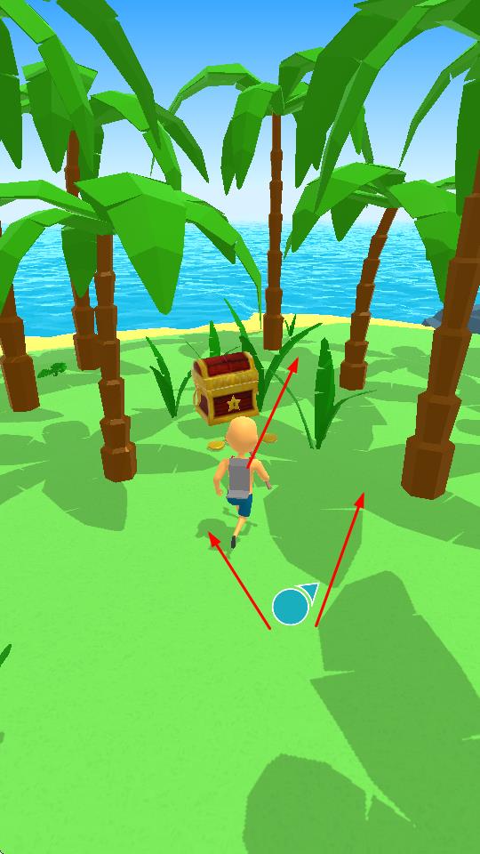1、玩家操控角色在海岛场景中自由移动,探索区域寻找宝箱等资源,利用屏幕虚拟摇杆控制行走方向,发现隐藏物品。