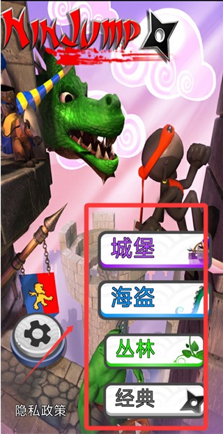 1、玩家将从基础场景出发,控制忍者角色左右跳跃,不断攀升至更高处,跳得越高,获得的分数也就越高。