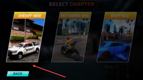 2、在章节选择界面,按箭头指示选择“SHERIFFMOD”章节,进入游戏场景。
