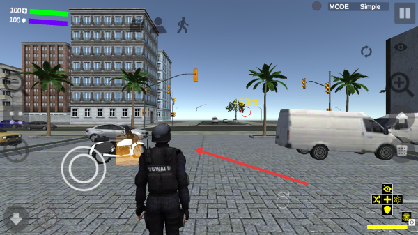 3、在游戏场景中,操控SWAT角色,按箭头方向在城市街道执行追捕等任务。
