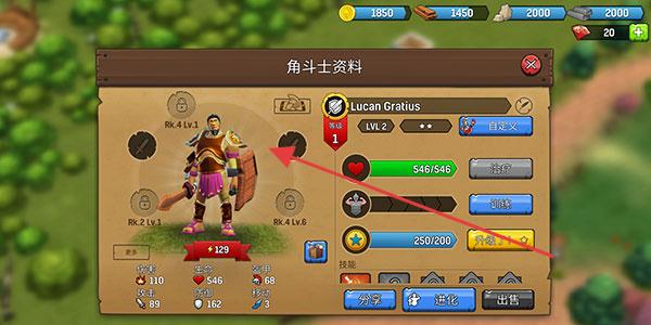 2、角斗士升级后,查看属性变化(如攻击、生命),确认升级收益,继续培养增强战力。