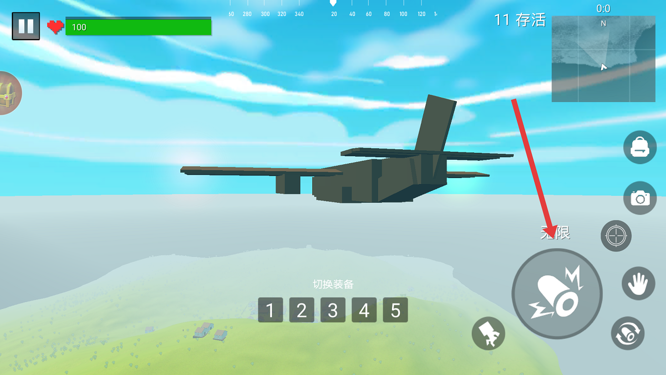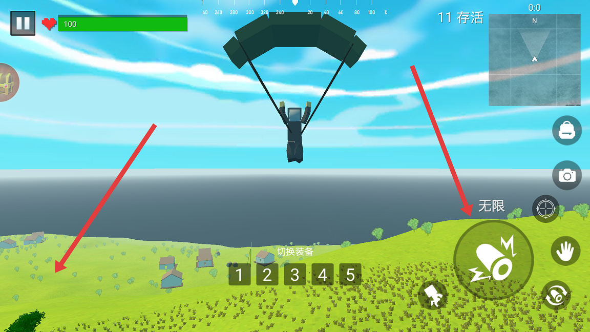 3、看小地图找一个没有红点的地方降落,左手控制移动,右手无限子弹开火。