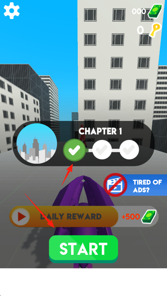 1、前期准备在游戏主界面,确认CHAPTER1进度,点击START开始第一章关卡,可领DAILYREWARD(每日奖励)。