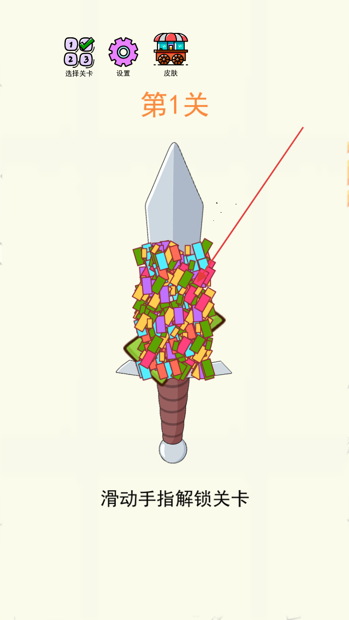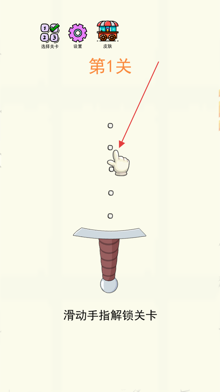 1、在关卡选择界面(如第1关),滑动手指解锁关卡,让刀具穿过圆点,切碎彩色方块。