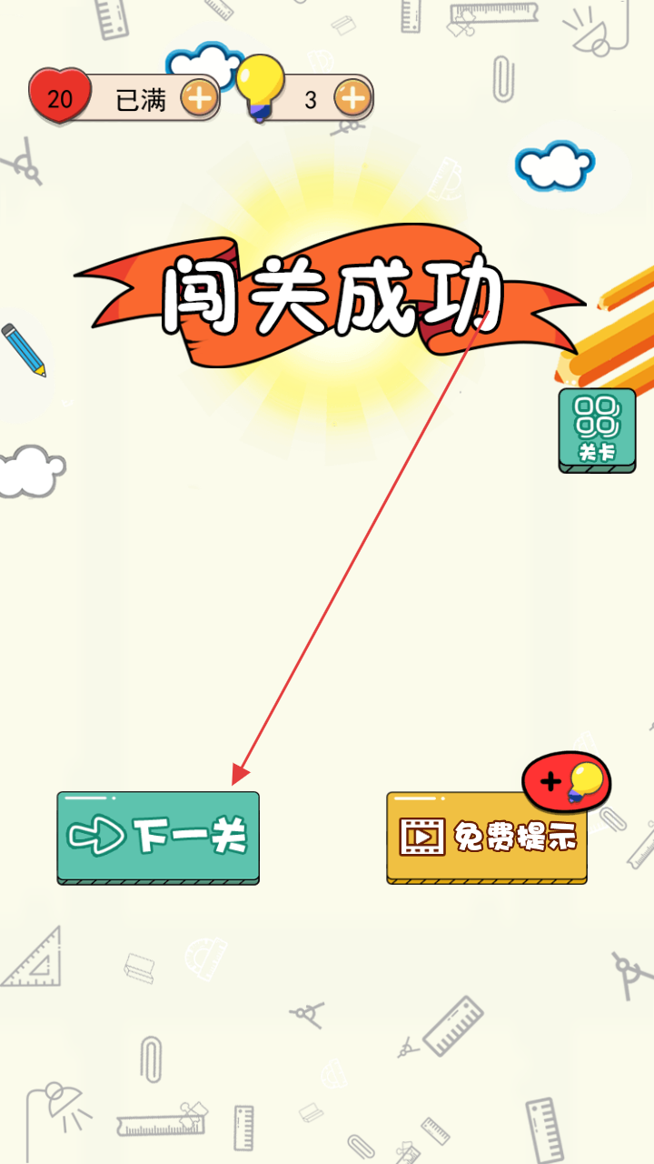 3、成功后点击“下一关”继续挑战,可利用“免费提示”功能辅助,积累进度解锁更多关卡。