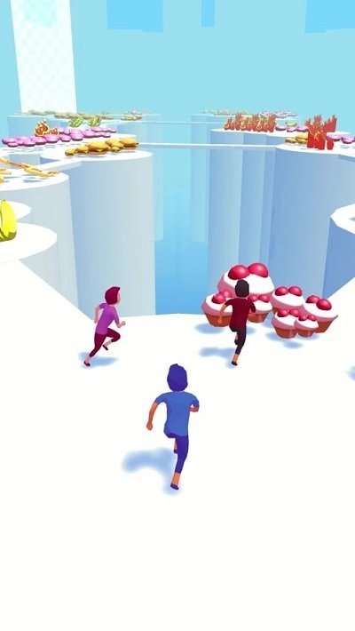 1、操作角色滑动屏幕控制蓝色及其他颜色角色,在美食主题跑道有蛋糕、汉堡上,沿路径前进,避悬崖、障碍。