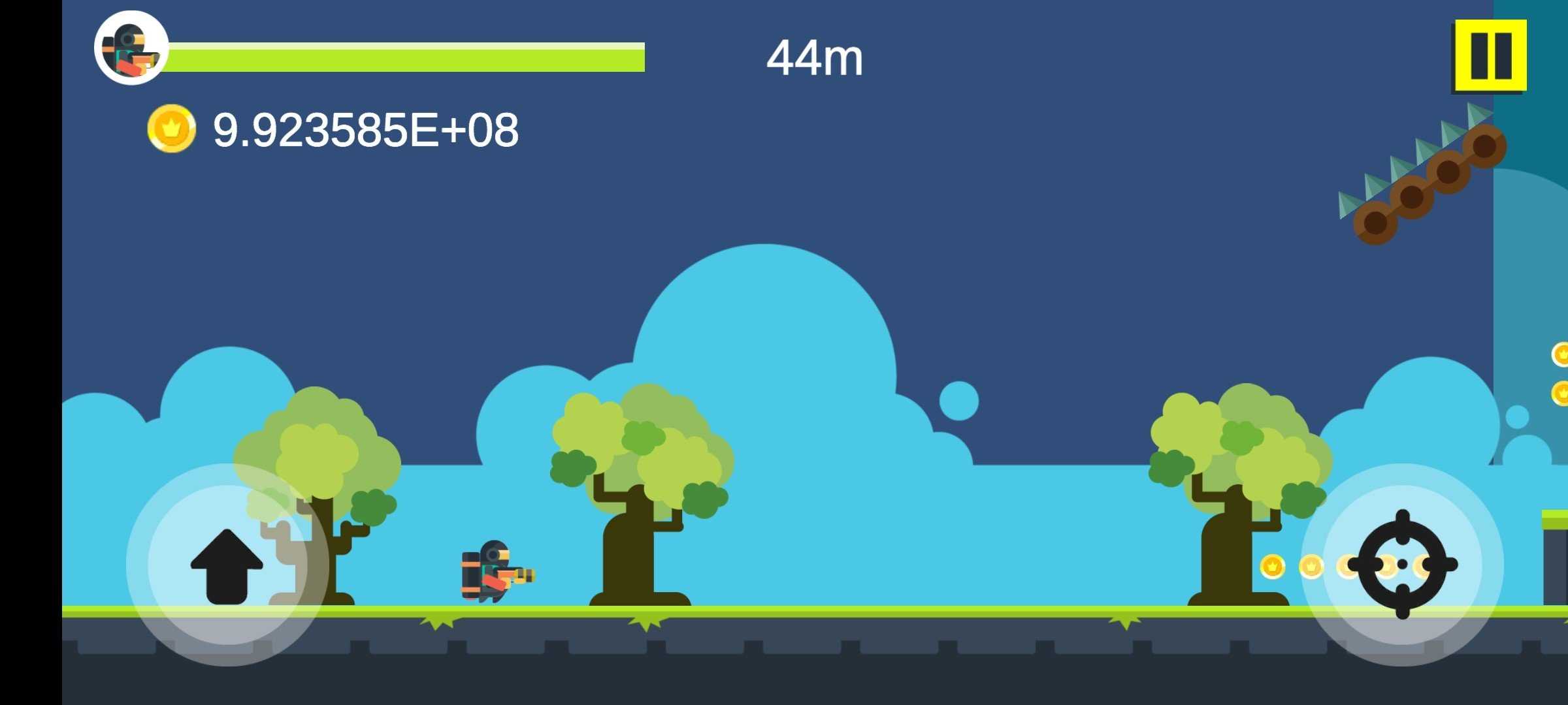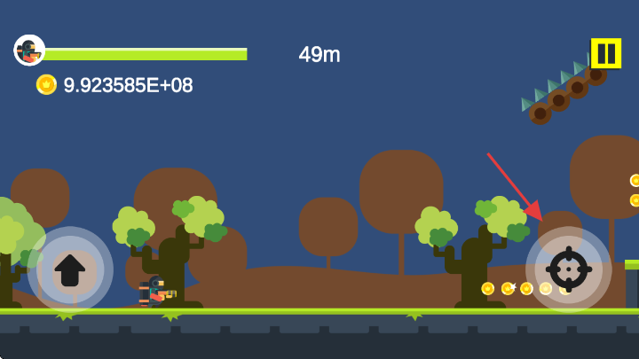2、左侧【向上箭头】控制角色跳跃,躲避地面障碍,右侧瞄准按钮可射击目标,同时收集金币,上方显示距离和金币数量。