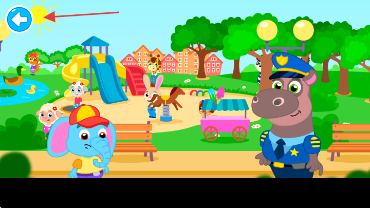 3、在公园场景中,与警察互动,左上角蓝色箭头可返回上一界面,场景含滑梯、小动物等元素。